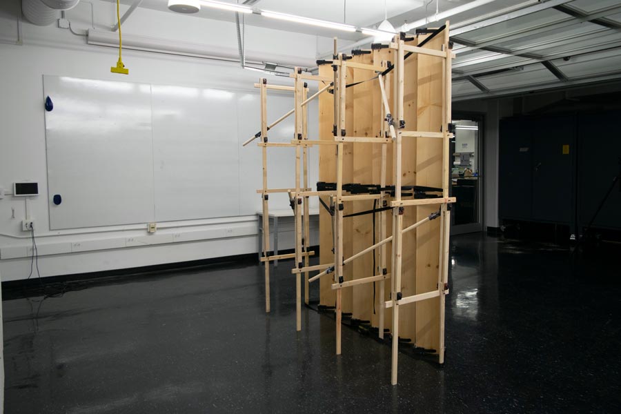As a parts project, serialization is seen as an advantage. However, the effectiveness of serialization is not found in the reproduction of a singular part, but is instead hijacked from the existing mass-produced parts of the existing building materials logistics network. Lastly, standardization in joints between materials are designed as a range of possible connections around specific dimensional constraints. These variations in connections allow for unpredictable outcomes in their respective assemblies, making it possible to construct the most standard appearing assemblies to the most abnormal assemblies. In the terms of Parts-In-Progress, this is the concept of “calculated precarity.”